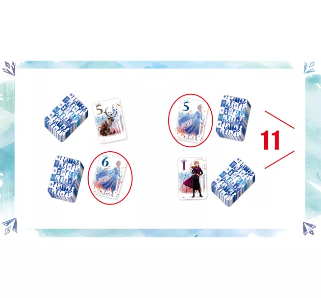 3.玩家輪流翻開牌庫的牌,依序在場中央疊成四堆棄牌堆,一旦場上出現相同人物的數字牌,立即相加,最快喊出正確答案的玩家,獲得先翻開的卡牌。