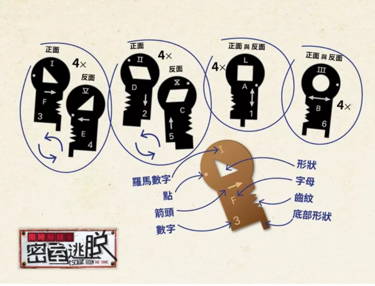 每個劇本關卡各分成三階段,每一階段你必須找到一組共4個數字的密碼,並從16把鑰匙中找到對應的數字,按照正確排序將它輸入計時解碼器,只要在時間內找到3組密碼,即成功逃脫!